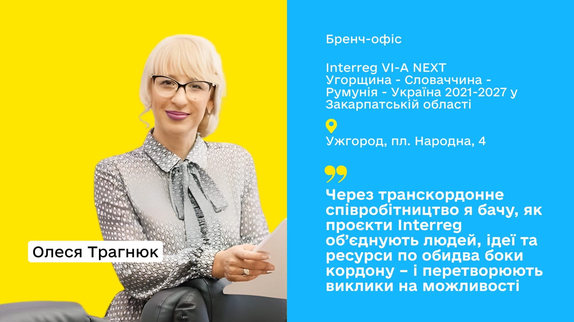 «Я люблю свою роботу, бо вона дозволяє мені щодня працювати над реальними змінами для мого регіону. Через транскордонне співробітництво я бачу, як проєкти Interreg об’єднують людей, ідеї та ресурси по обидва боки кордону – і перетворюють виклики на можливості. Це робота, в якій є і стратегія, і людяність, і конкретний результат для Закарпаття»