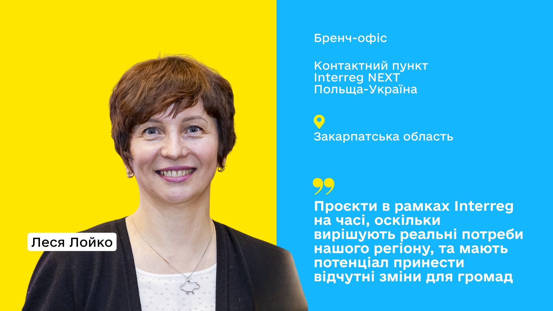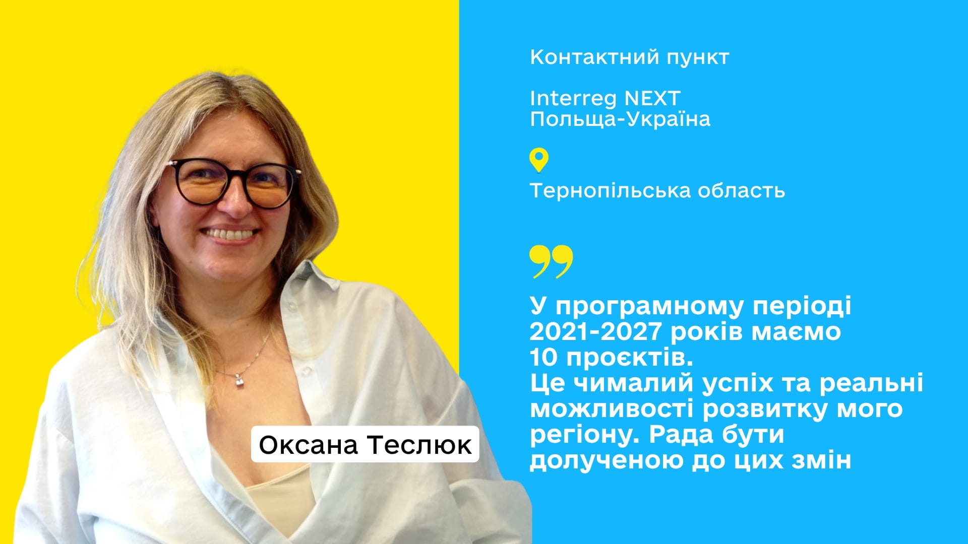 І врешті в програмному періоді 2021–2027 років маємо 10 проєктів. Це чималий успіх та реальні можливості розвитку мого регіону. Рада бути долученою до цих змін і допомагати їм відбутися!»